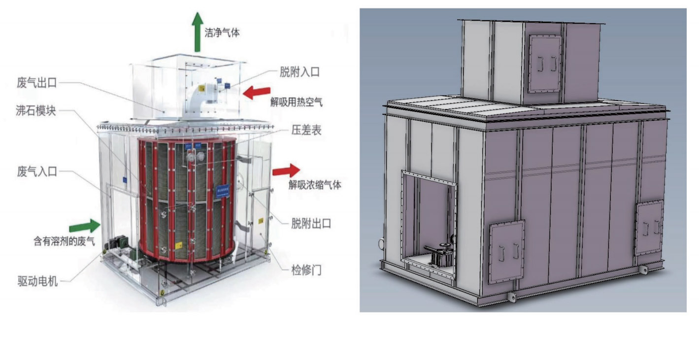 沸石濃縮轉筒被分為吸附區、脫附區、兩個功能區。